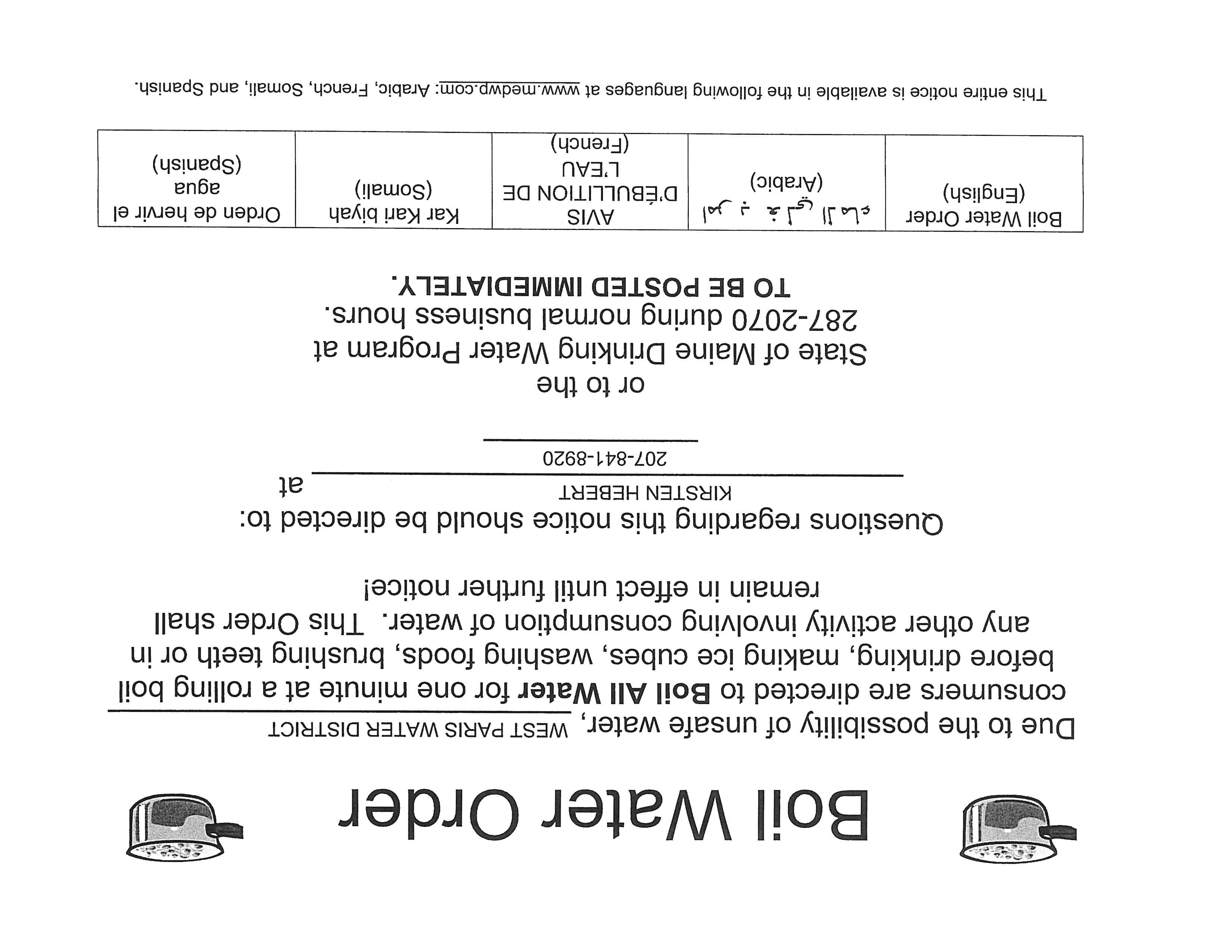 Boil Water Order (BWO) samples will be taken and we will notify customers when the BWO is removed. This is an action that can only be done by the Maine Drinking Water Program -